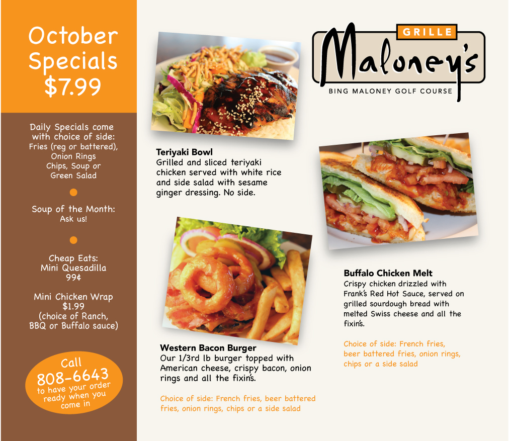 Maloney’s Grille is open from 6:00 AM — 6:00 PM everyday! Stop by and eat up October’s tasty specials.