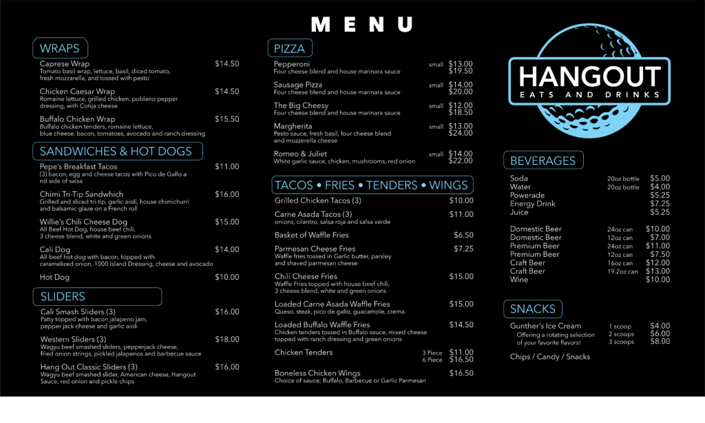 The Hangout Eats & Drinks is located at the Haggin Oaks Driving Range at 3645 Fulton Avenue in Sacramento, CA. Click HERE to see the hours of the driving range. Phone Number: 916.223.2980